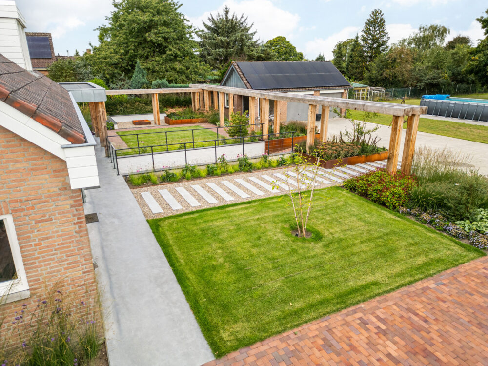 Om het open karakter van de tuin te behouden is gekozen voor sterke lijnen en robuuste materialen. Zo ontstaat een tuin die rust uitstraalt maar tegelijk uitnodigt om hem echt te gebruiken.