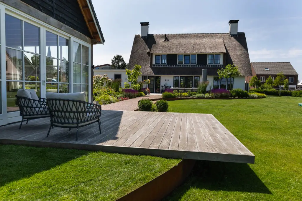 Materialen spelen een belangrijke rol in een landelijk moderne tuin. Natuurlijke elementen zoals hout, gebakken klinkers, grind en natuursteen worden vaak gecombineerd met moderne accenten. Deze mix zorgt voor een warme, eigentijdse uitstraling waarin comfort en natuur samenkomen.